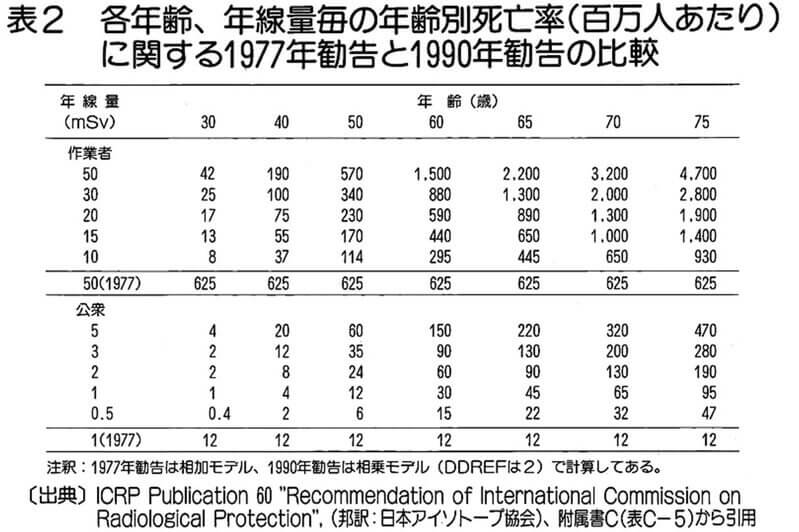 科学なんてものは、データのどの部分を抜き出すかによって、どうにでも安全・危険の基準が変わってしまいます。ですから、NHKの御用学者達が安全と言っていることも間違いではありません。特に低線量の被曝に関しては、長期で被曝線量ごとに人を追跡したデータが殆どありません。ただ、それで反対側の意見をスポイルしていいと言う話ではありません。特にマスコミや学者は。命に関わることで、どちらか分からない時、学説の分かれる時は、安全策をとるのが普通の感覚ではないでしょうか? 一応、いままで基準にしていたデータ(表2)があるのですから、御用学者はそれを無視したり、軽んじたりする理由を最初に説明するべきでしょう。